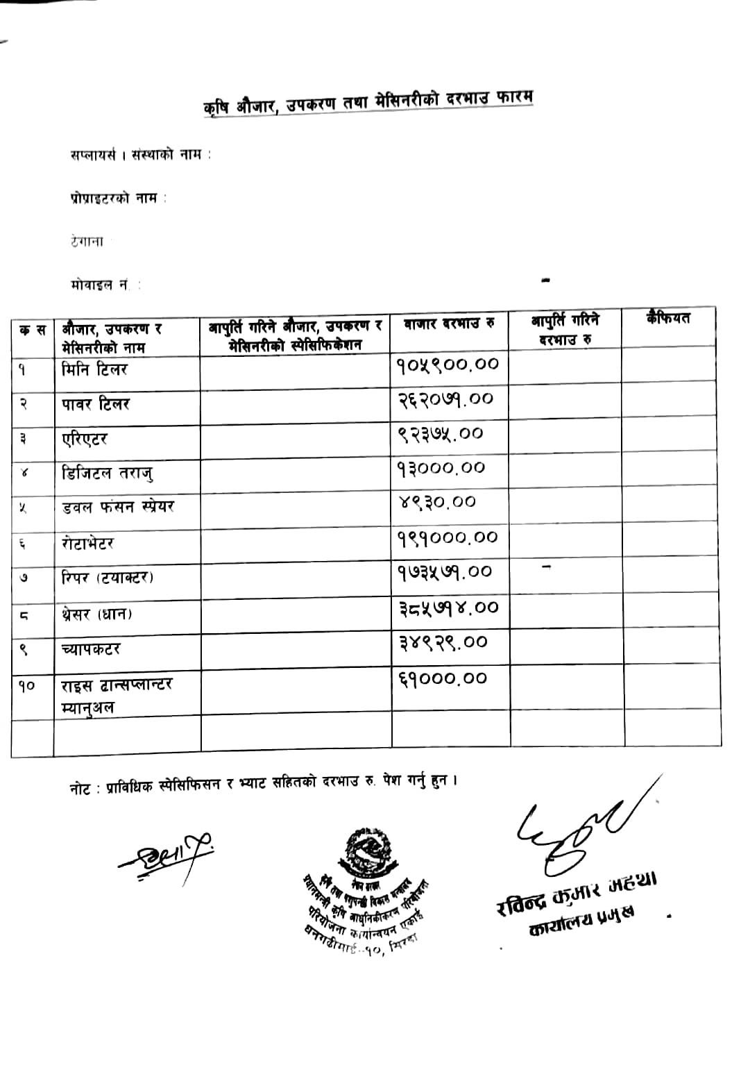 | 8 | कृषि औजार, उपकरण तथा मेशिनरीको औसत दरभाउ फारम। आ.व.2079/080 | फारमहरू | 2079-05-12 | View | Download |